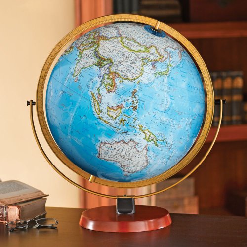 With just a touch, the ten bright LEDs inside our Byrd desk globe illuminate to bring even greater clarity and detail to our award-winning cartography. With the same blue ocean coloring of our most popular wall maps, it's suitable for home, office, and classroom alike. More than 4,000 place names are printed on paper gored, adhered to a plastic globe. Die-cast, copper-painted meridian and hardwood base.